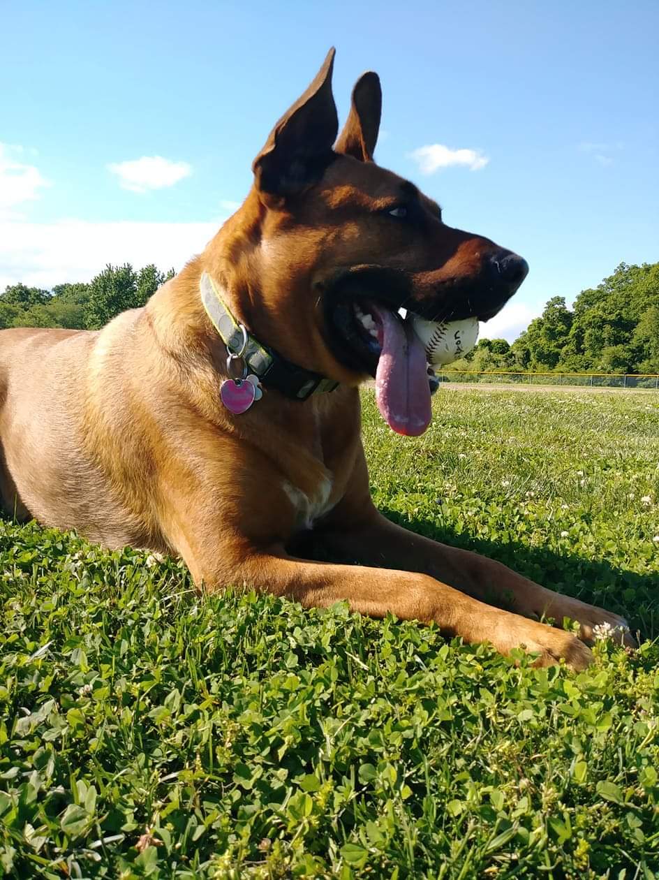 Hi, my name is Schatzi, I'm 5yrs old, German Shepard/Boxer mix. I love playing with sticks, chase balls and going for rides. I especially love to play tug-of-war and tease by hogging all the balls in my mouth. Since I was a puppy I can put sticks under my collar with my mouth and walk around waving it. Sometimes people think I'm scary with my loud bark, but that's me, I'm just a kid, that's what I do. I love to snuggle under the covers and give kisses.