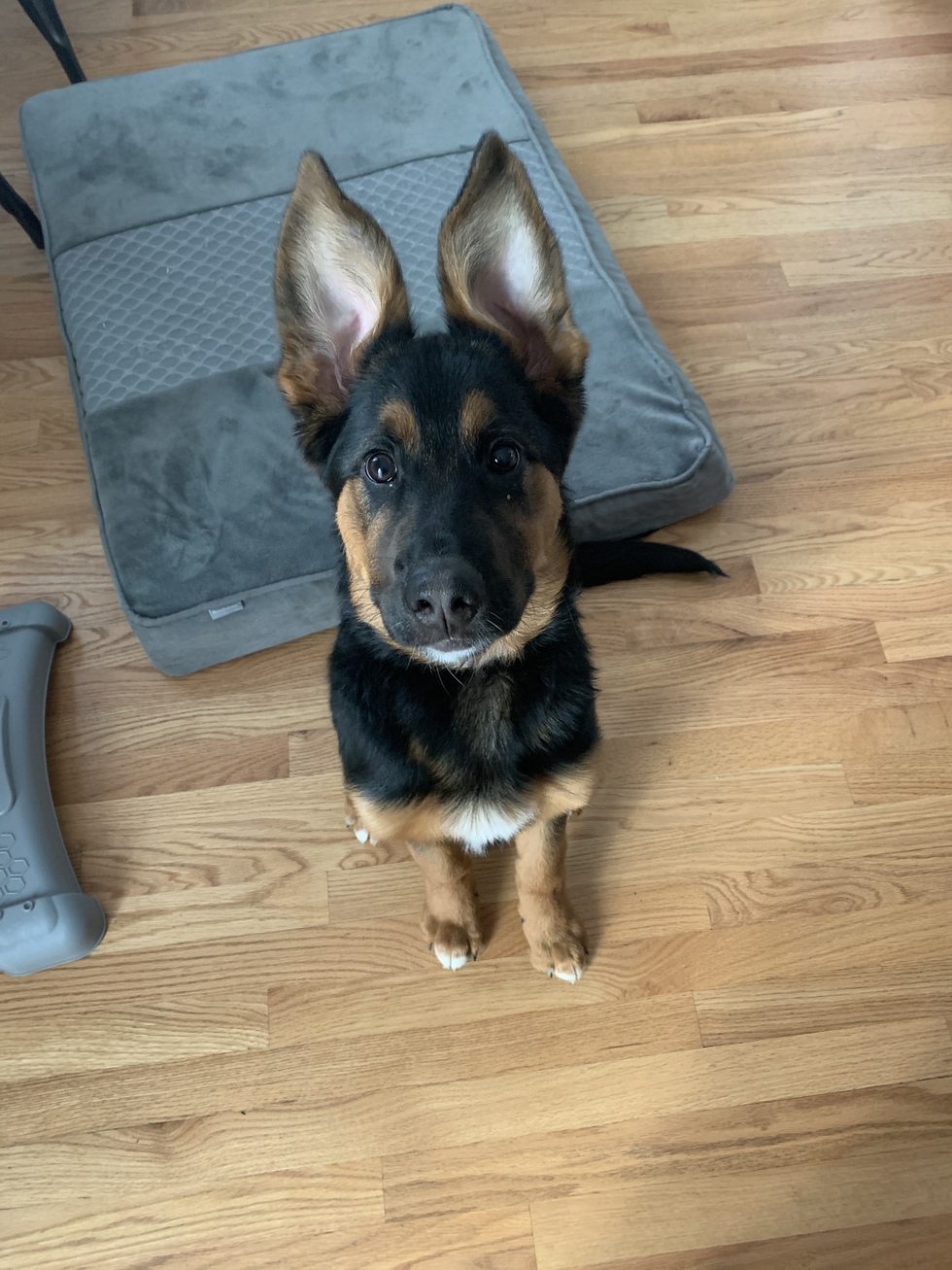 Meet Tag. A quirky mix of German Shepherd and Bernese Mountain Dog. On even days, his ears stand up. On odd days, they fall down. Every once in a while, one ear stands up while the other is down; he inherited this quirk from his dog mom! He is able to get 27 digital channels in full HD on the even days, just look at those antennae's! He is much cheaper than Cox cable; we accept Bully Sticks for payment!