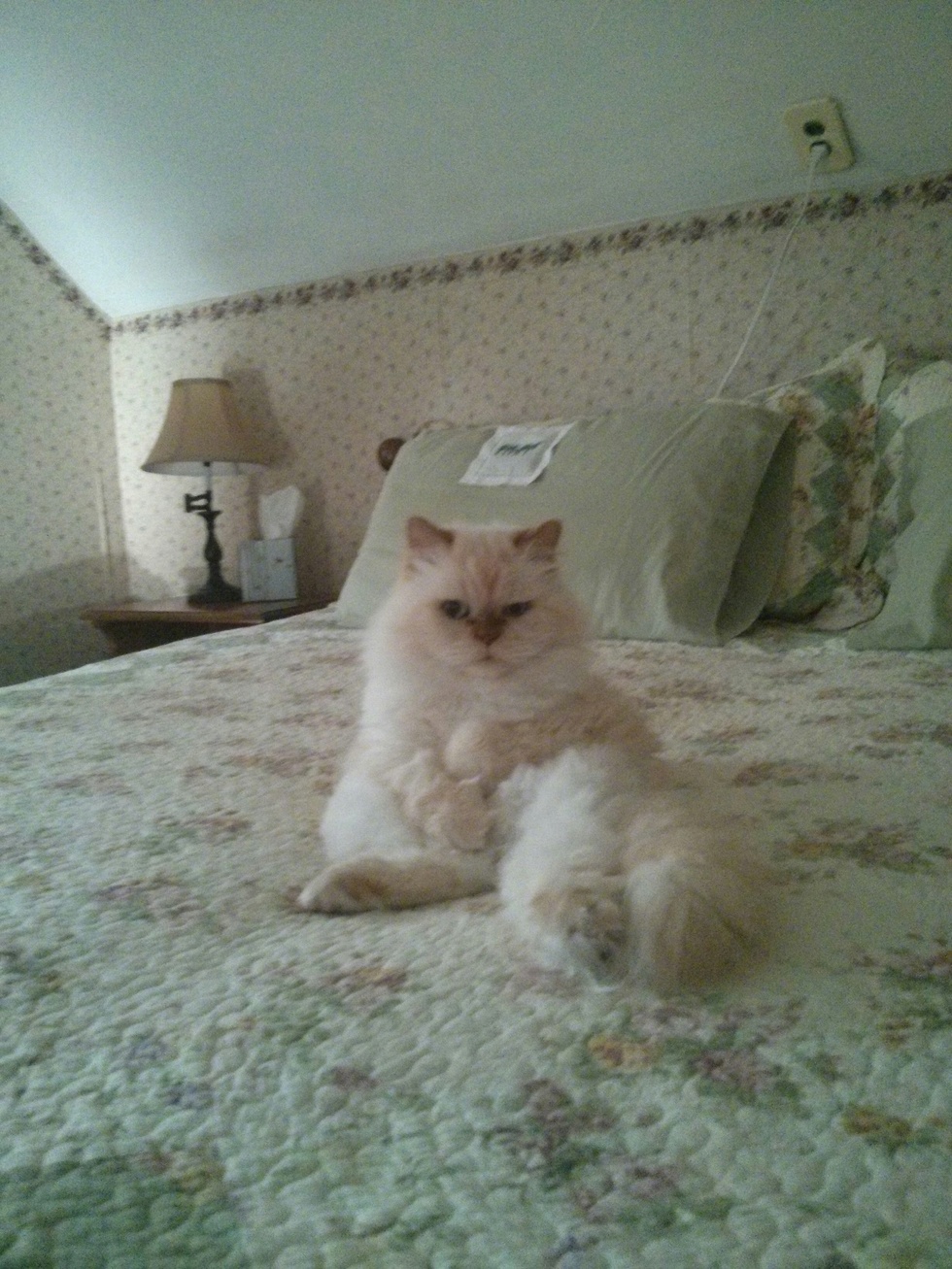 years ago. He is a well mannered Flame Point Himalayan and happily shared our home with our German Shepherd dog. As you can see from the photo, Konrad sits on his rump much like bears do. He is a warm and friendly pet with the family but is reserved around guests.