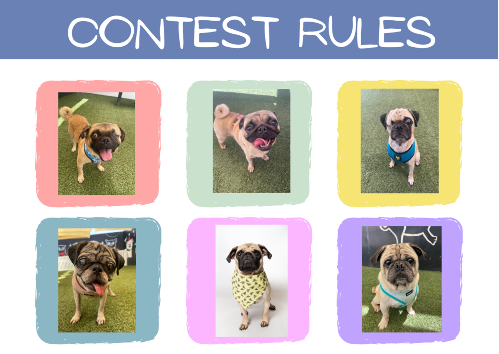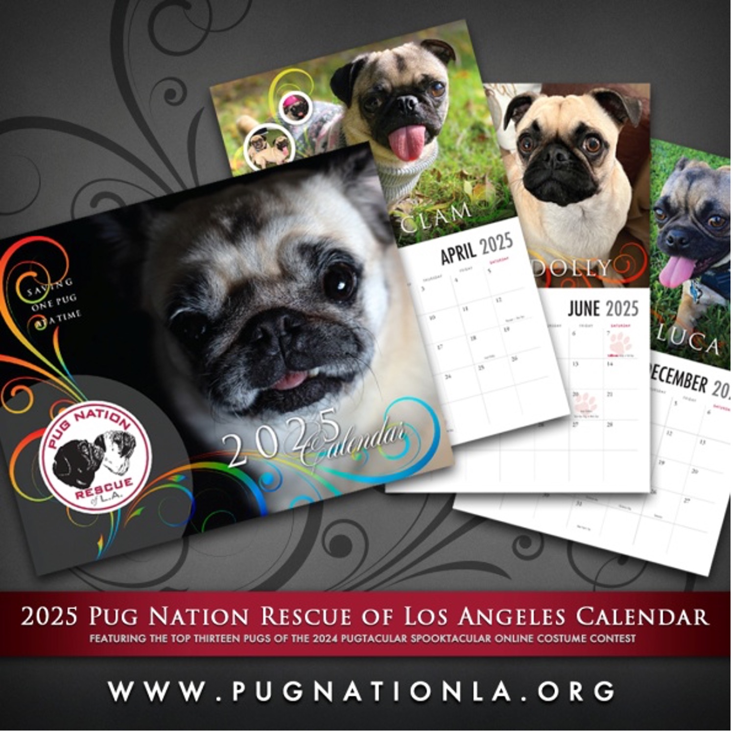 THE TOP 12 WINNERS will be incorporated into our exclusive and amazing Pug Nation 2026 Calendar which we will sell through our website! That's right, YOUR pug's picture will be featured in our 2026 Pug Nation Calendar and the Grand Prize winner not only will be featured on the COVER of the calendar, but also will have a feature story and large photo layout on the inside page. Winners also receive great prizes (see "prizes" section) and all proceeds from the sale of the calendar will be used to save more Pugs.