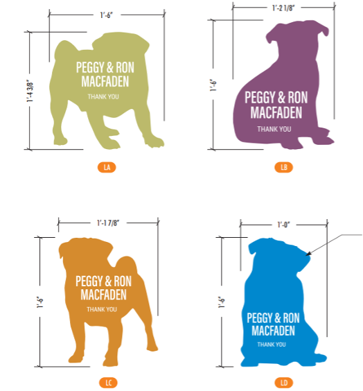 Your pug's pictures and bio in the calendar on the month of your choosing AND a personalized pug silhouette (value $250) to be placed on our Wall of Honor in our new facility, the "Pubble"...you get to choose your color and personalized inscription.