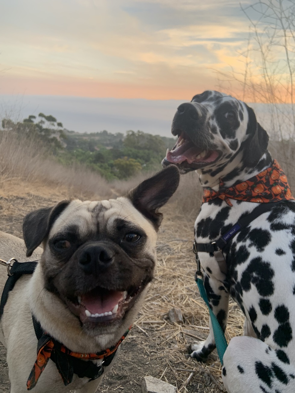 Lamb was adopted from Pug Nation in 2020 after he was found as a stray. Lamb is a sweet little boy who loves to play with his BFF Benny, go on hikes, dance for treats, and just be an overall silly little guy!
