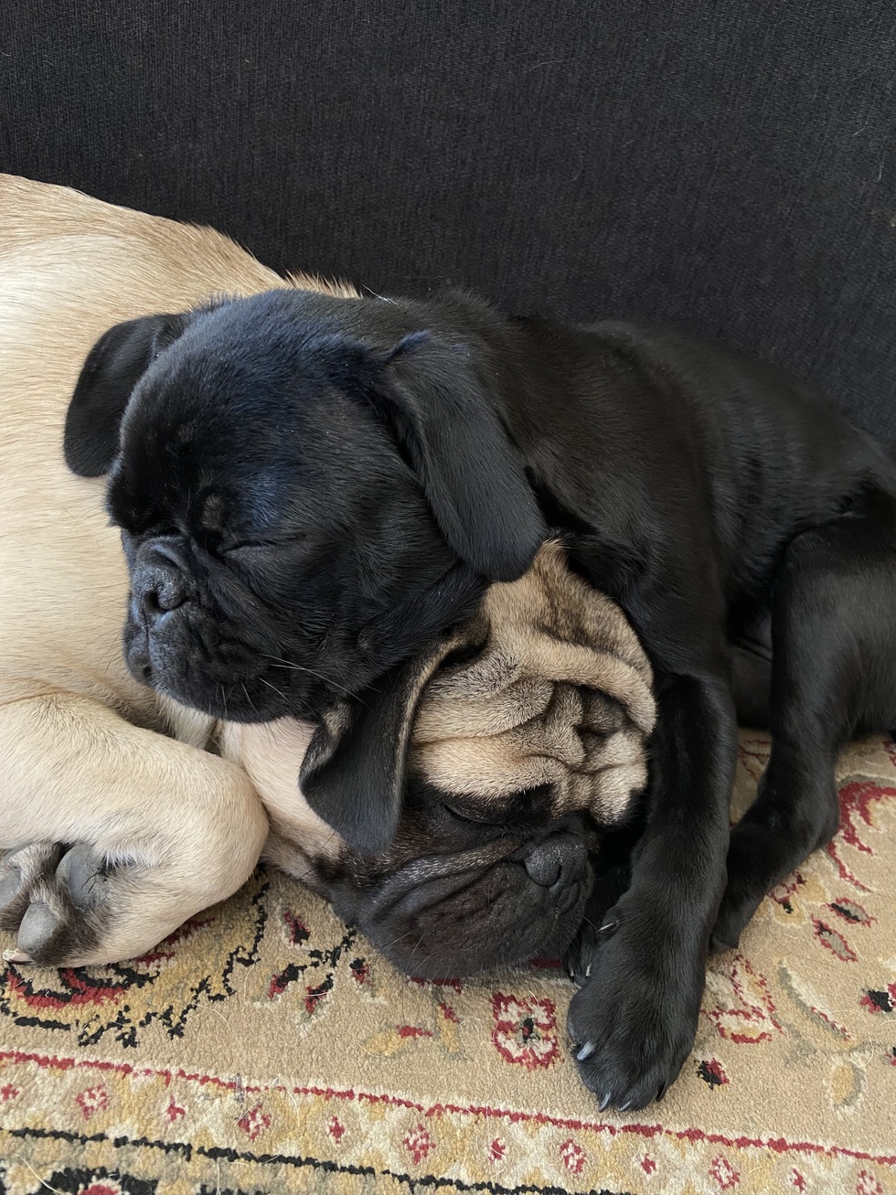 fries (5) and yumi (3) are a dynamic duo for sure. we had to take fries in because his older (non related sibling) was bullying and dominating him. he was a happy surprise since our parents just brought him home one day during quarantine. but with just his luck, our dad surprised us with yet another, smaller pug (eventually named yumi) who happened to take over the household as her own. whether she snatches a toy out of his mouth, gives him a good slap to the face when he barks at the tv, or gets in his personal space, they always end up cuddled next to each other by the end of the night for a well deserved rest, ready to take on the next day together all over again.