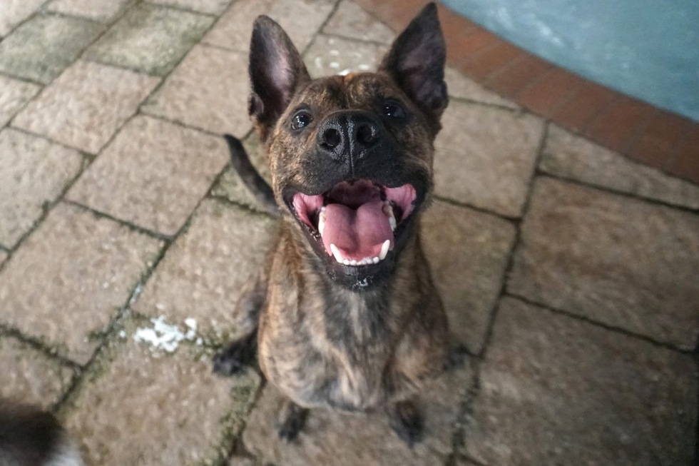 A rescue, his deformed paws resemble those of a grizzly bear while helping him swim like a brindle otter.