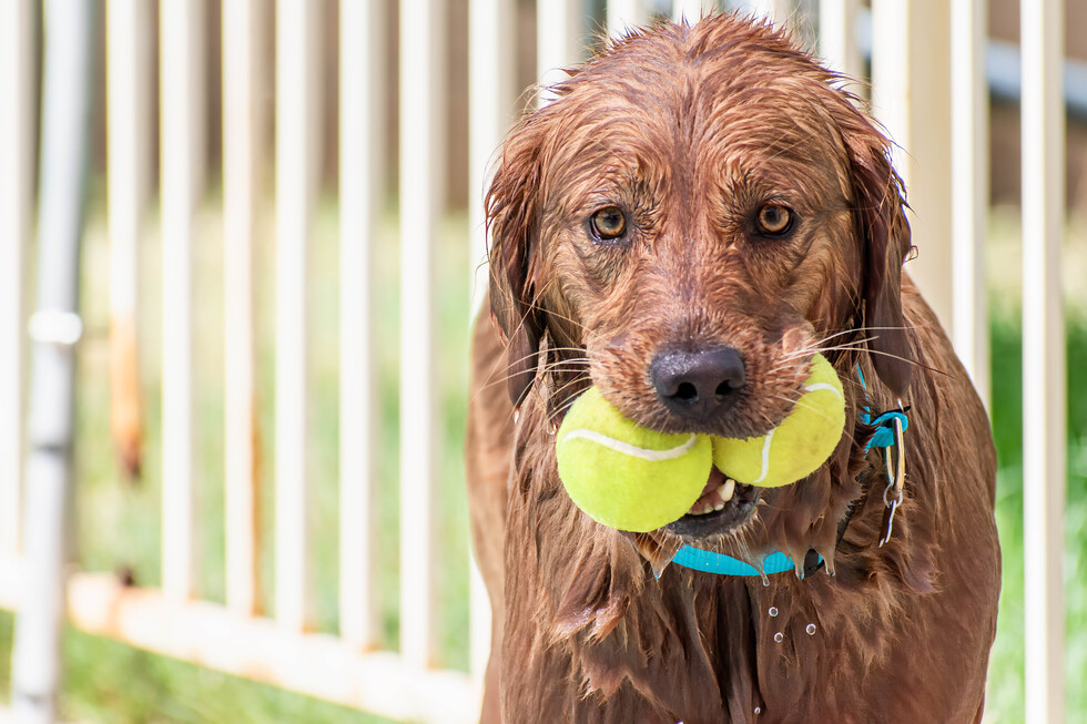 I adopted Remi through RAG about 8 months ago. She obviously loves the water and manages two balls in her mouth most of the time. She is a joyful and brings joy to my heart,