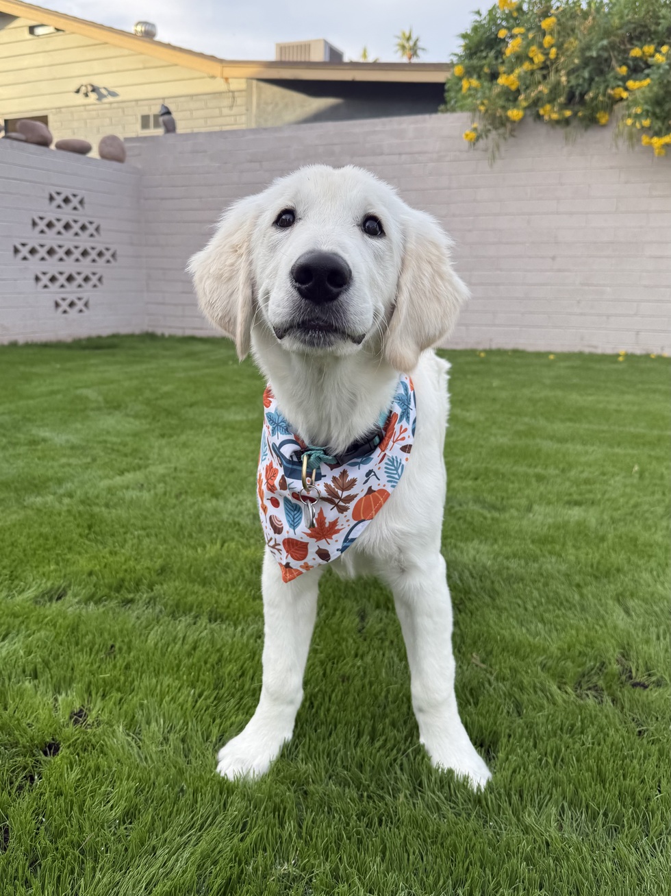 Simon came to us at three months old through Rescue A Golden AZ. We got the call, and a few hours later, he was home with us. He has flourished unbelievably and grown into just the sweetest, most joyful boy. He makes us laugh every day, and we feel so lucky to see new parts of his sparkling personality develop as he grows.