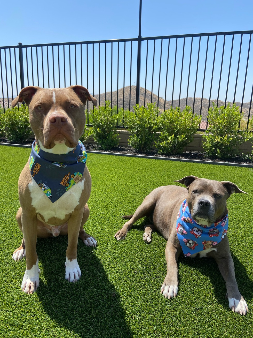 Mack was rescued by Paws for Life, prison training program in which the incarcerated train dogs to be good citizens as well as therapy or PTSD service animals! Sally was rescued from Angel City Pitbulls after being found wandering the streets of Los Angeles. They live their best lives in So. Cal.
