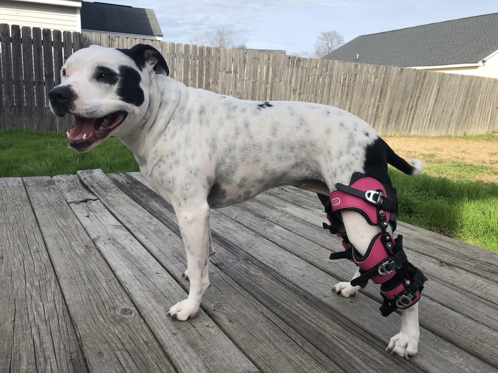 I am the best ambassador for the Palmetto Rescue Brew Beer because...Caddin was a very special find one night out in Ravenel, on Caddin road, by my co-worker's son-in-law. They didn't have room for her, so they reached out to me to see if my pitbull Nova wanted a little sister. Caddin was just 4 months old and had 4 large puncture wounds on her back that are still visible to this day. We think she was used as a bait dog and abandoned due to her kind heart and unwillingness to fight. She is the most loving pitbull and loves everyone, and has completed my fur family ever since I lost my first pitbull Mercedes. However, there have been some trials and tribulations with her. Last November, she tore both CCL's and I thought she was going to need bilateral surgery to repair it. Fortunately, my dad found Posh Dog Knee Braces, and we began her physical therapy with her cute bilateral pink braces. Having those pink braces on her have been a blessing as well. All of my neighbors approach her and ask what breed she is. When I tell them, they are shocked at how personable and sweet she is, being a pitbull and all. She's have overcome a lot of obstacles and I believe she has helped others believe in the breed again. Caddin would be a great spokesdog because of her endurance and personality. Plus she looks like Petey from Little Rascals. This breed deserves redemption and Caddin is the first step.