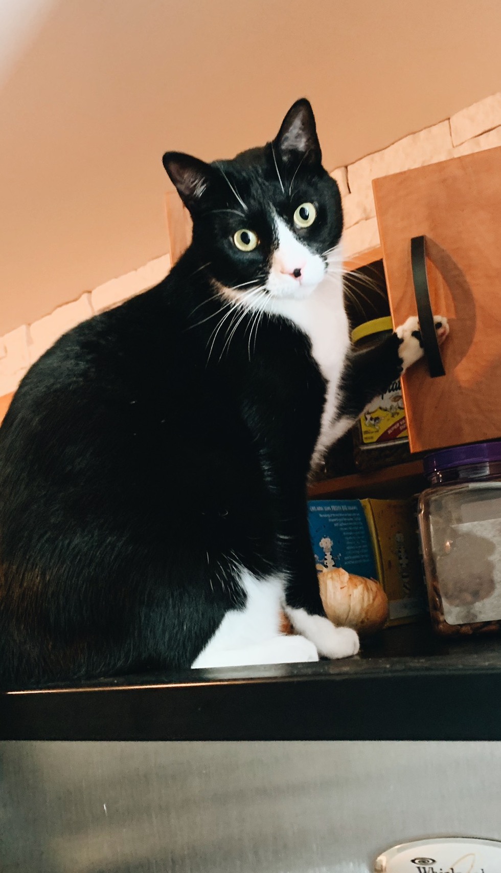 I am the best ambassador for the Palmetto Rescue Brew Beer because...Hello, Palmetto! I'm Bento, but my friends call me "Bug" for short. Mom rescued me when I was just a baby - and I'm so glad she did! I think of myself as a dapper and cheerful guy, always up for a chat or a relaxing nap on the couch. I'm pretty laid back, but I can also be a troublemaker - you'll notice me opening the kitchen cabinet in my picture, looking for where mom & dad hide the treats! I think my sharp tuxedo, handsome face, and chill-but-fun personality make me a perfect ambassador for Palmetto Rescue Brew Beer. We live close to Palmetto Brewing and mom & dad tell me y'all make some of the best beers in town! I definitely think this fuzzy face would move some cans, don't you? ; )