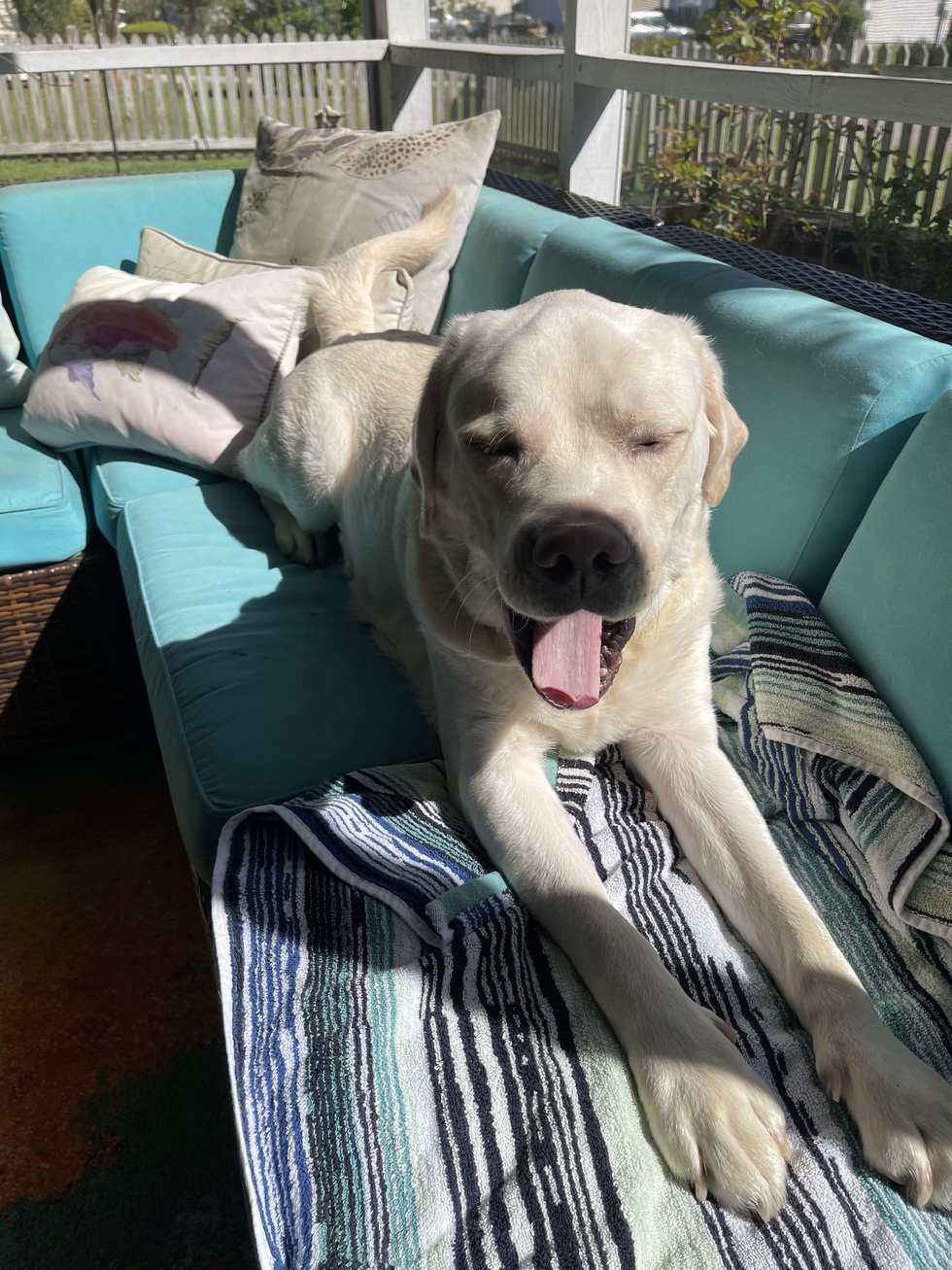Now it’s just me and my mom. I lay under her chair while she works. I’m the best coworker. After work (Pau Hana), we lounge on the porch and, sometimes, I help her pick out flowers and vegetable plants for her garden and then eat them after she’s worked so hard to plant them.