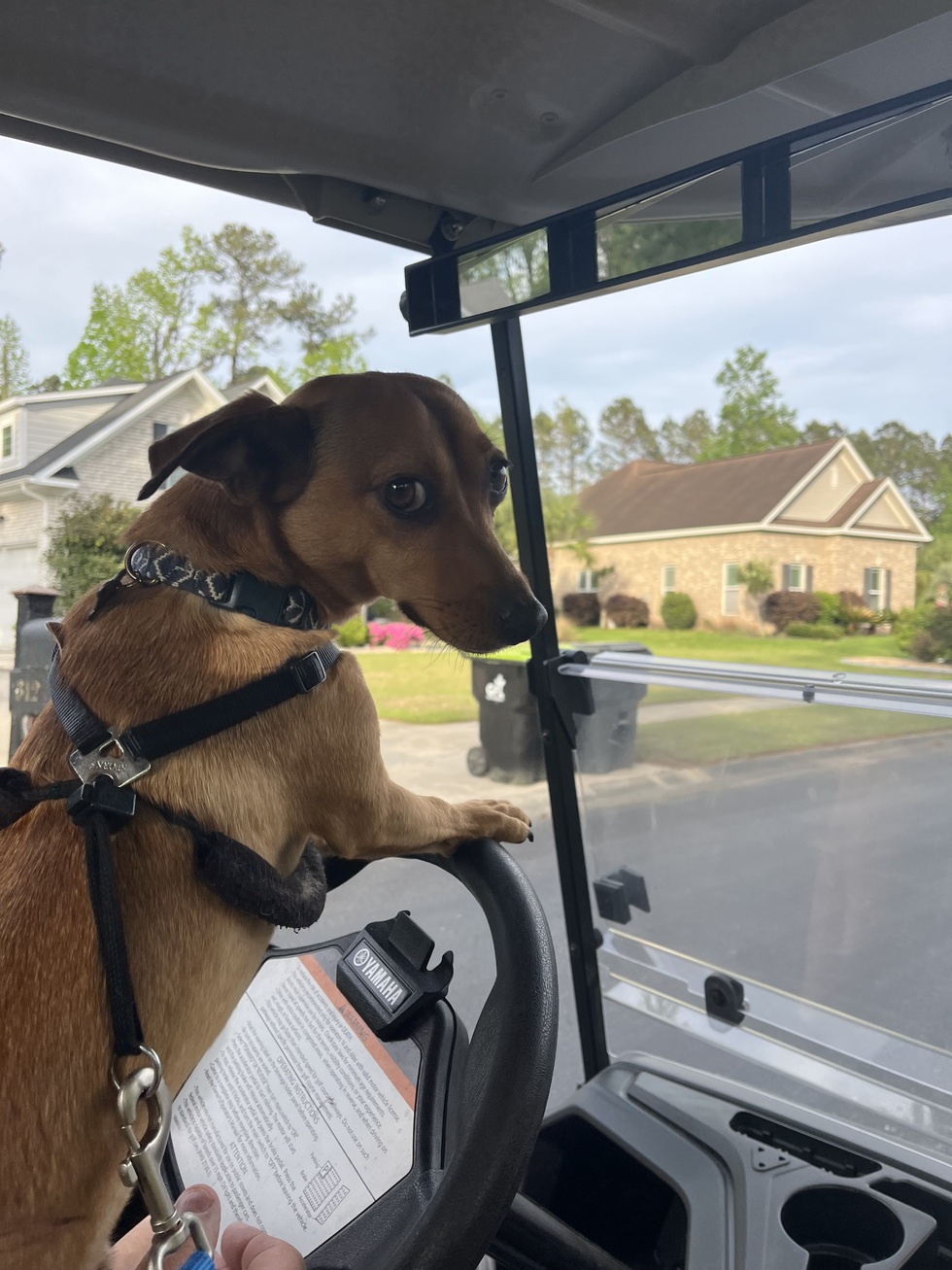 They call me Arnie, Arnold when they really want my attention. I’m named after Arnold Palmer since golfing is so popular where we live in the Carolina’s. These people adopted me after I was found wondering the streets in a rural town back in July 2024. They wanted a friend for their 10 year old adopted Beagle, and boy have I turned his calm life upside down!! People are always asking mom and dad what “breed” I am…please🥴Mom and Dad tell everyone “he is our Carolina street dog”. I am a mix of just anything wrapped up in a spunky energetic ball of energy! Why would you not want me as your ambassador?? I’m the coolest badass around. Instead of Carolina plates saying “Property Carrying” they should say “Arnie Carrying” !