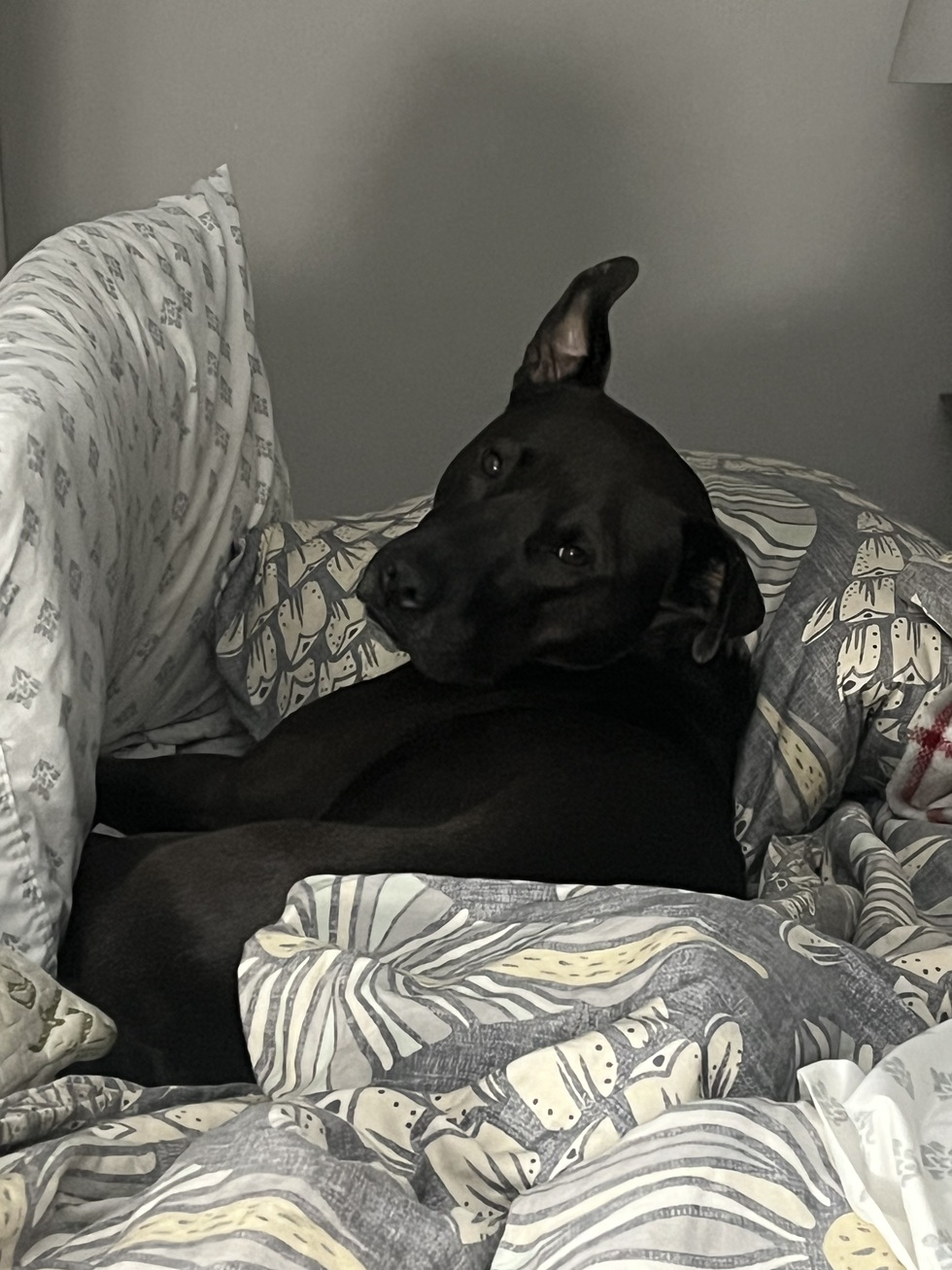 My new mom Catherine adopted me 2 years ago and she has loved me every day since. I sleep with her in her king size bed. She walks me nearly every evening; my youngest human brother likes to come too-our walks are his favorite time of the day. Mom takes me for car rides (my favorite). Mom takes me to the beach where I fetch tennis balls and greet other dogs. Mom taught me patience-I learned to wait politely to have my breakfast & dinner though sometimes the waiting makes me drool a bit. My family relies on me to protect our house when my family is not home-people say I sound terrifying even though I’m not.