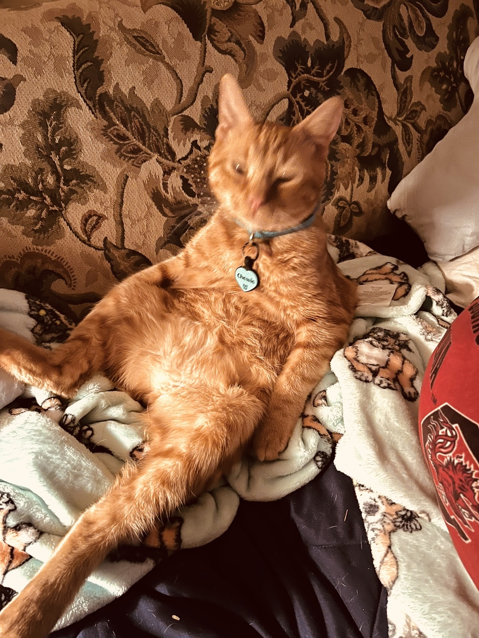 Wendy’s as just a wee kitten when a worker picked me up . He asked my now mom if I could go with her . I was very skinny and weak . My tail was messed up and the vet had to remove most of it . I am now a healthy one year old with a duck tail living my best life pouncing on the rescues Jack Russel that is my favorite pet . My mon severely broke her leg 8 months ago . I think having me around for her long recovery was medicine to her soul 🩵