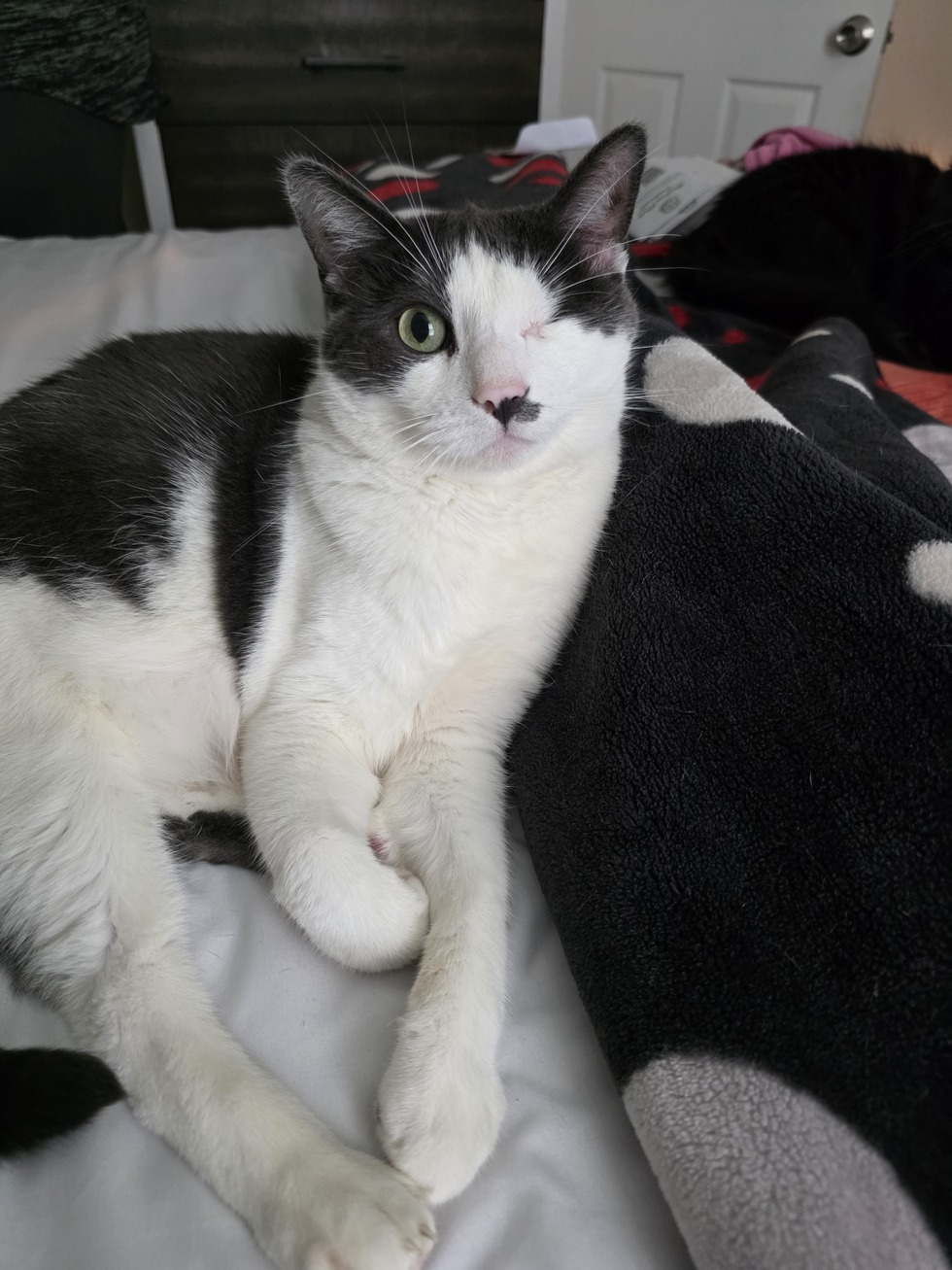 I adopted Jax (formally Scott) because I read he had no interests only having 1 eye. I fell in love with his cute face instantly! He's the sweetest kitty ever! He's my little shadow abd a purr machine. Dont let the one eye fool you! He's just as rambunctious as if he had 2 eyes!