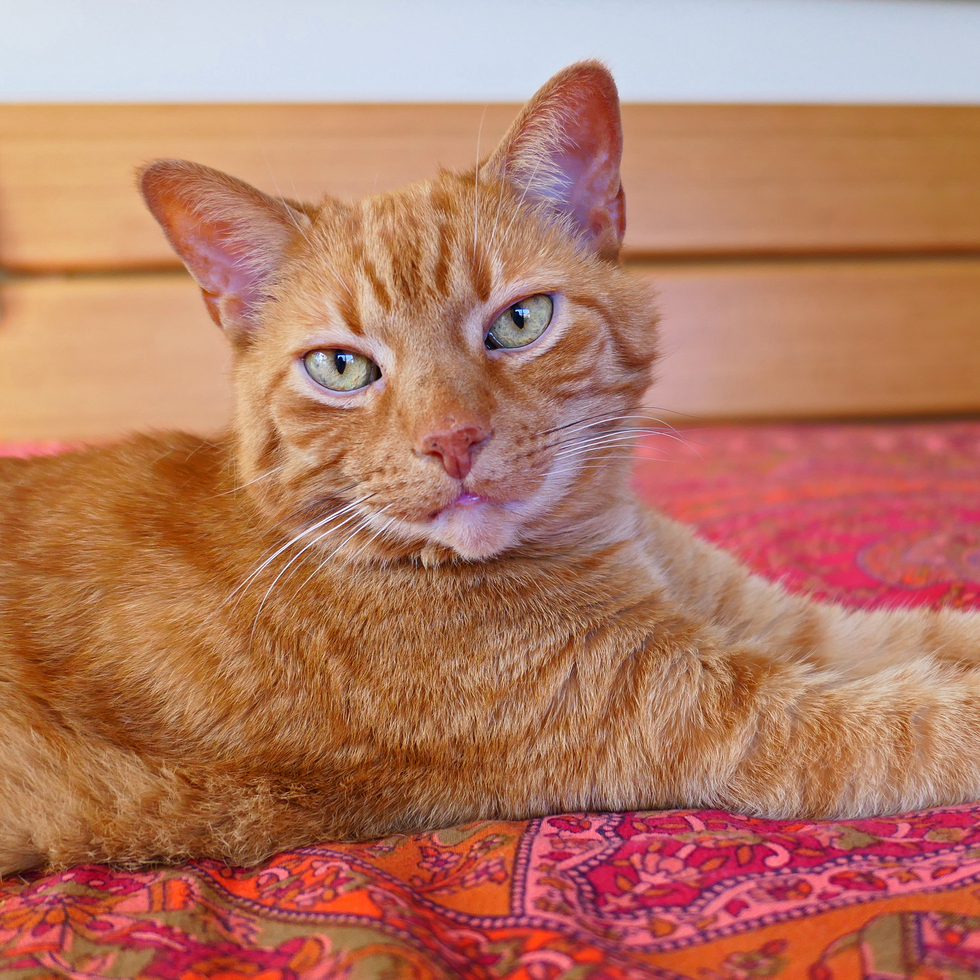 Mahatma was a rescue from multiple litters at a homeless camp when he was about 6 weeks old. He was tiny and feisty when he came into our house, then grew into the biggest, and mellowest cat we've ever known. Well, like a lot of orange tabbies, he was not mellow about food! Mahatma was 14 in this picture.