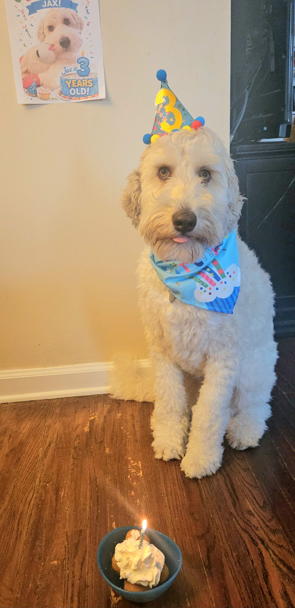 Jax is a certified therapy dog. His super hero power is visiting people and places in the community to help make gloomy days a little brighter!
