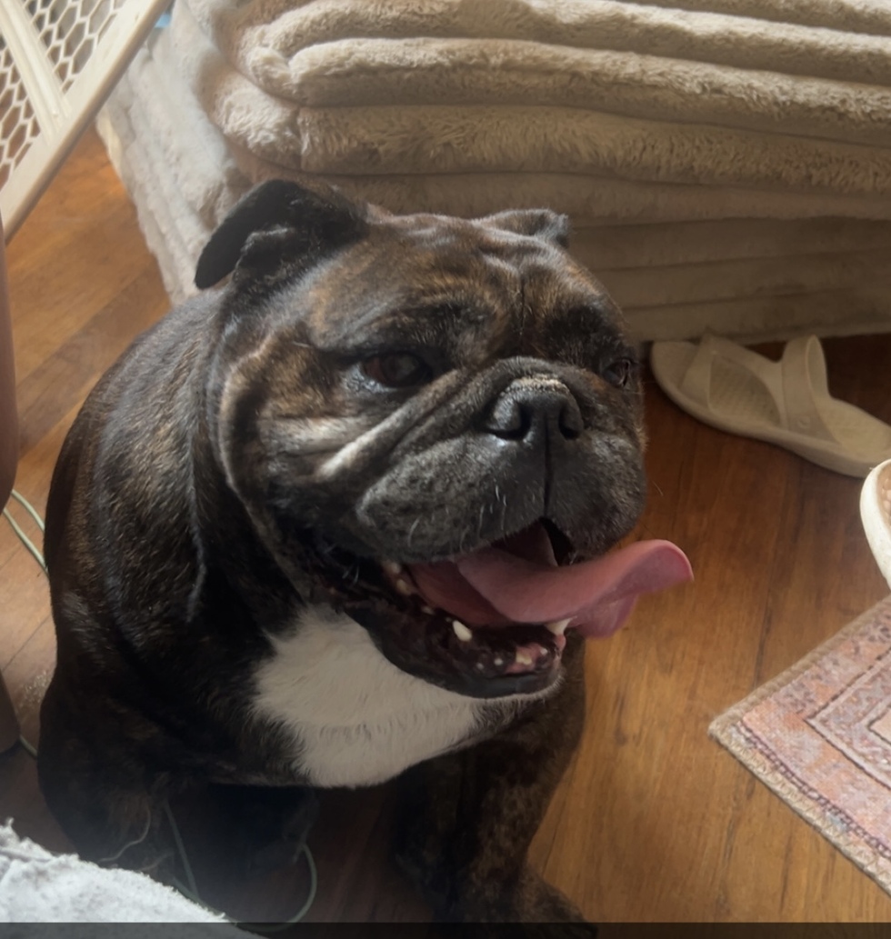 This English bulldog‘s name is Grapple. He’s very full of energy which is uncommon for bulldogs. He loves to play. He loves to ride in vehicles and if you open your car door, he’ll jump in and then run around so you can’t catch him to get get him out.!