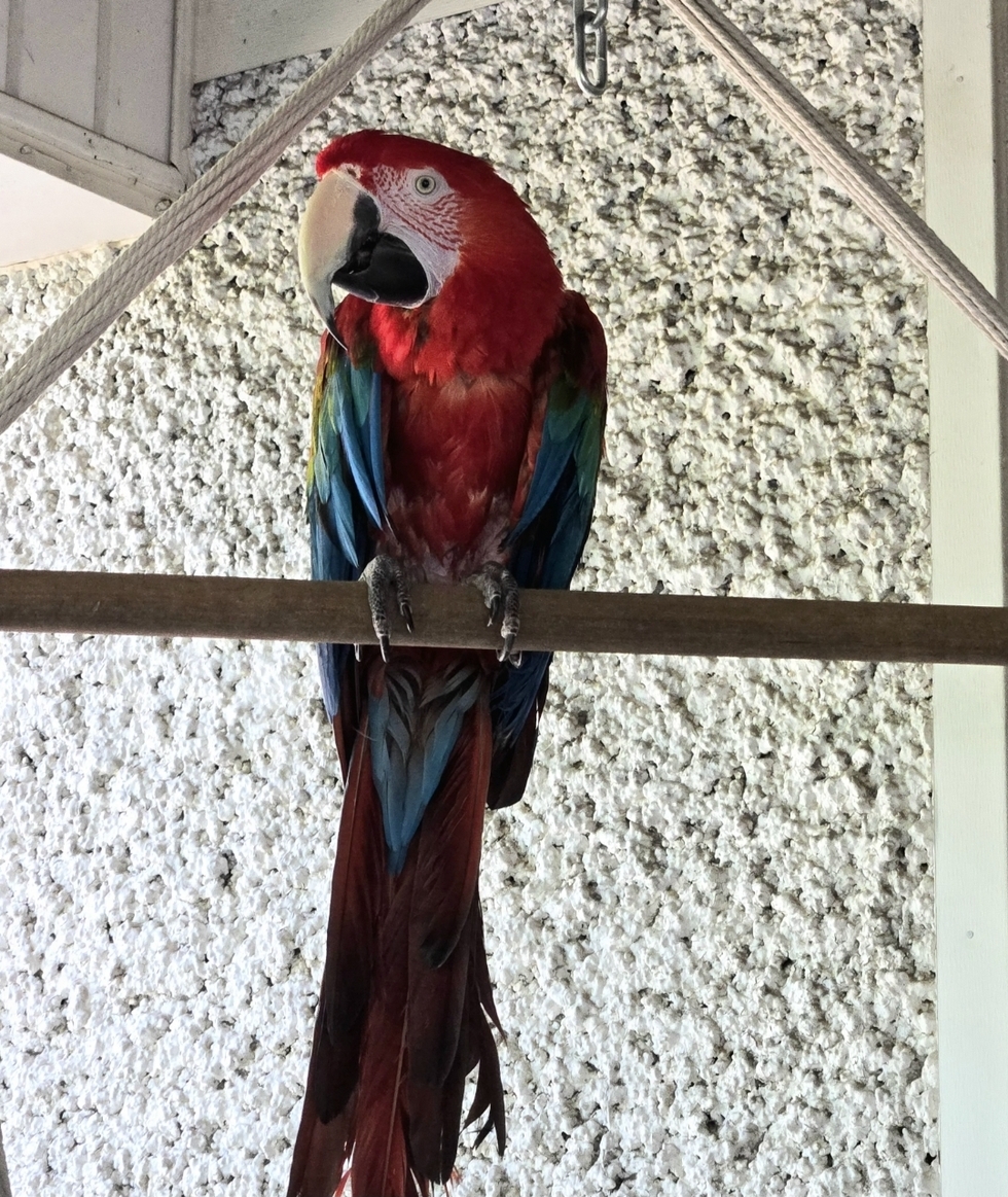 Gotchi is a rescue. His previous owner had passed away. He'd plucked himself almost bald and was terrified of men but he's grown back his front feathers and has become more and more loving and playful. His favorite toy is a stuffed dinosaur he growls at.