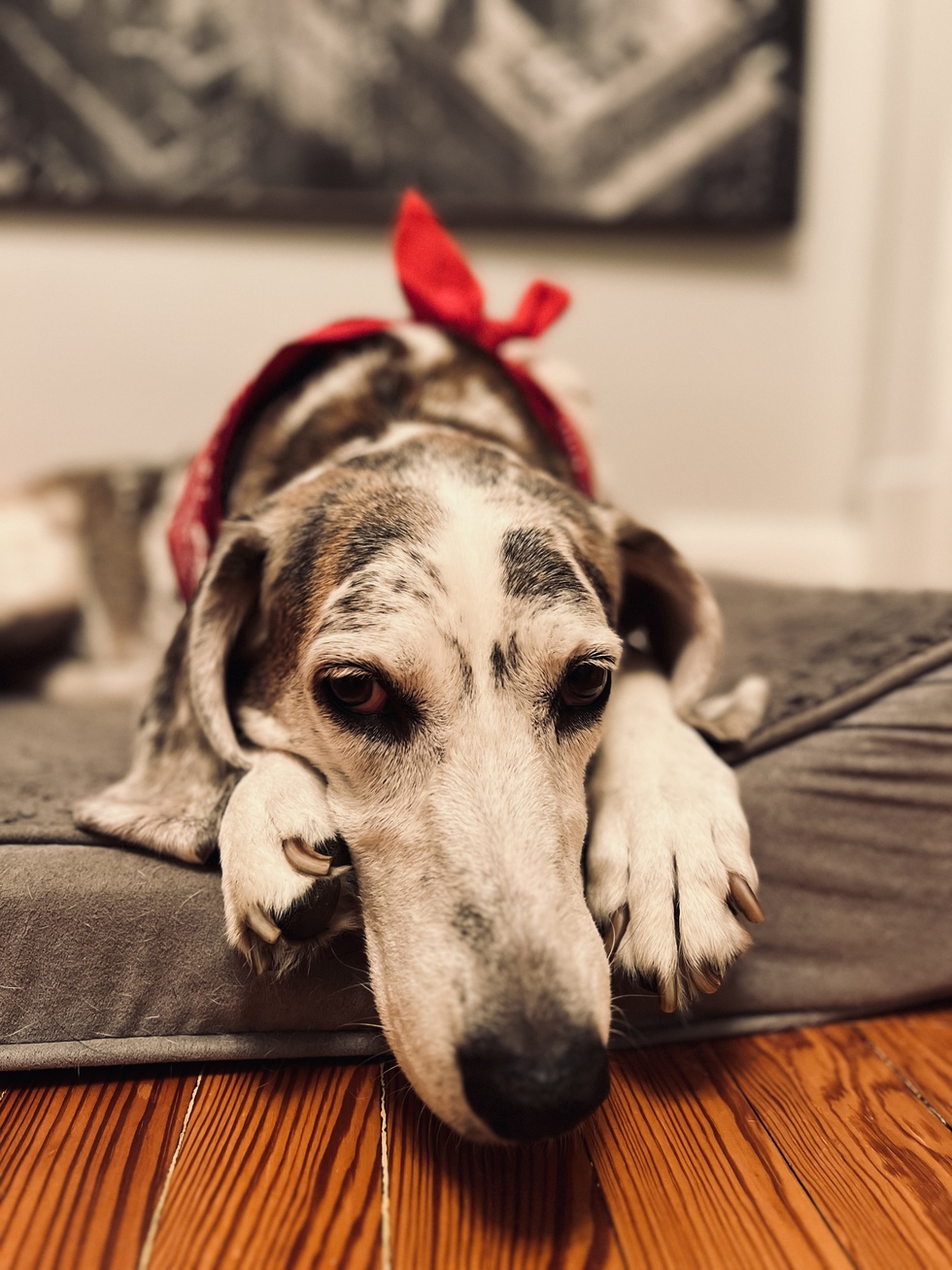 Wednesday is our senior rescue, half Catahoula, half treeing walker hound, and 100% GOOD GIRL. After a rough start in life - abandoned and abused by previous owners - she’s lived a life of canine luxury, doted on by mom and dad and two human sisters.