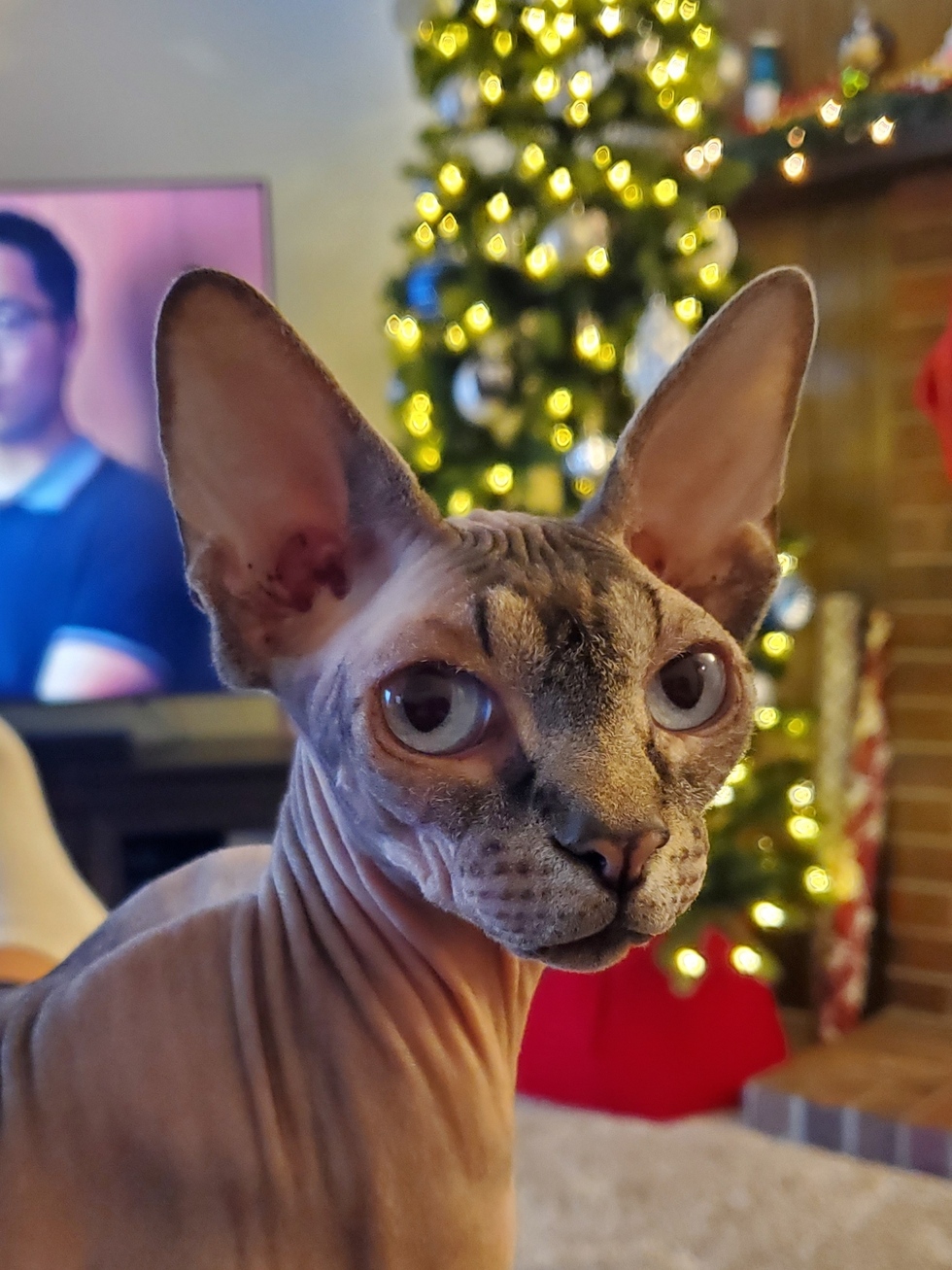 This is Eerie. She is a 5 year old Sphynx. Eerie was adopted in Kansas City when she was 7 months old. Although she looks like a cat, she actually plays fetch and loves to walk on a leash outside like a dog! She is my only cat so I consider her my naKID (get it??! 😂)!