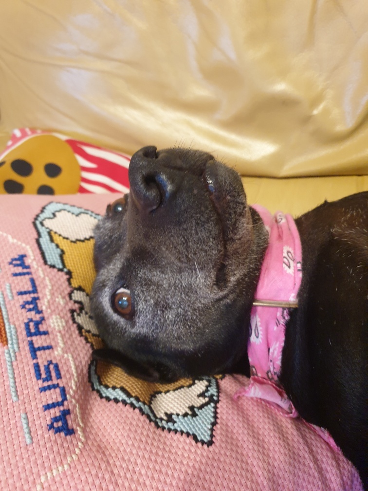Pet's QuirksShe does all her tricks if there’s food in front of her. She has Sharpei ears and tail, Staffy build and Labrador appetite.