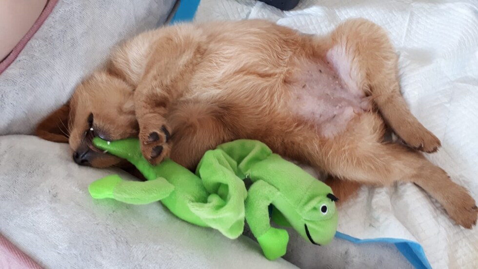 She loves her snotty (green lizard toy)