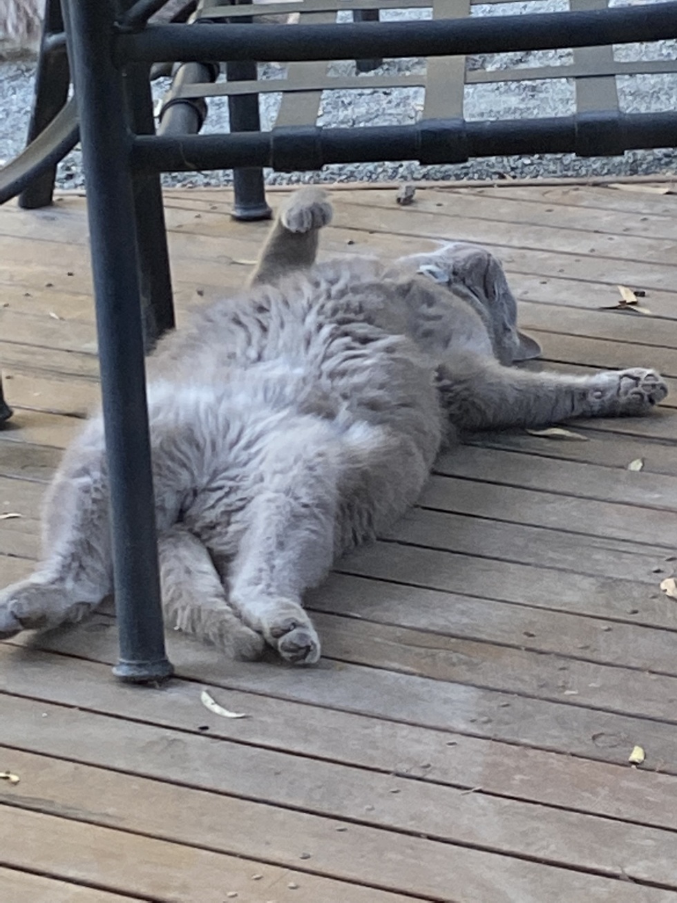 Pet's QuirksThis is Sam’s favorite position after his dinner. Flat on his back in the sunshine. Sam is a British shorthair that weighs 9.5kg.