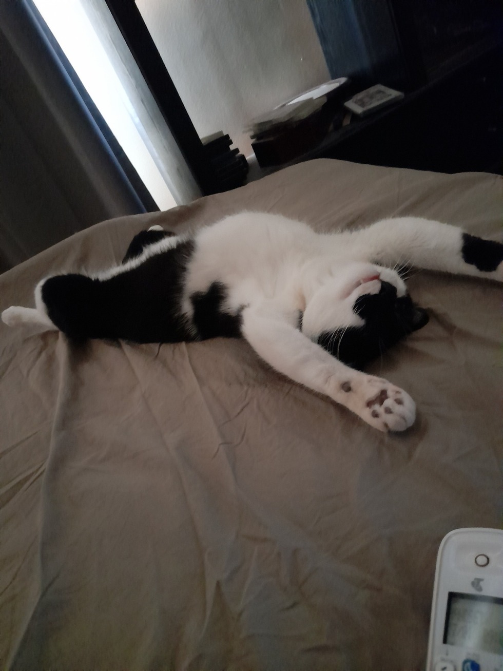 Sampson likes to sleep; chill out or relax flat on his back with his paws stretched out.