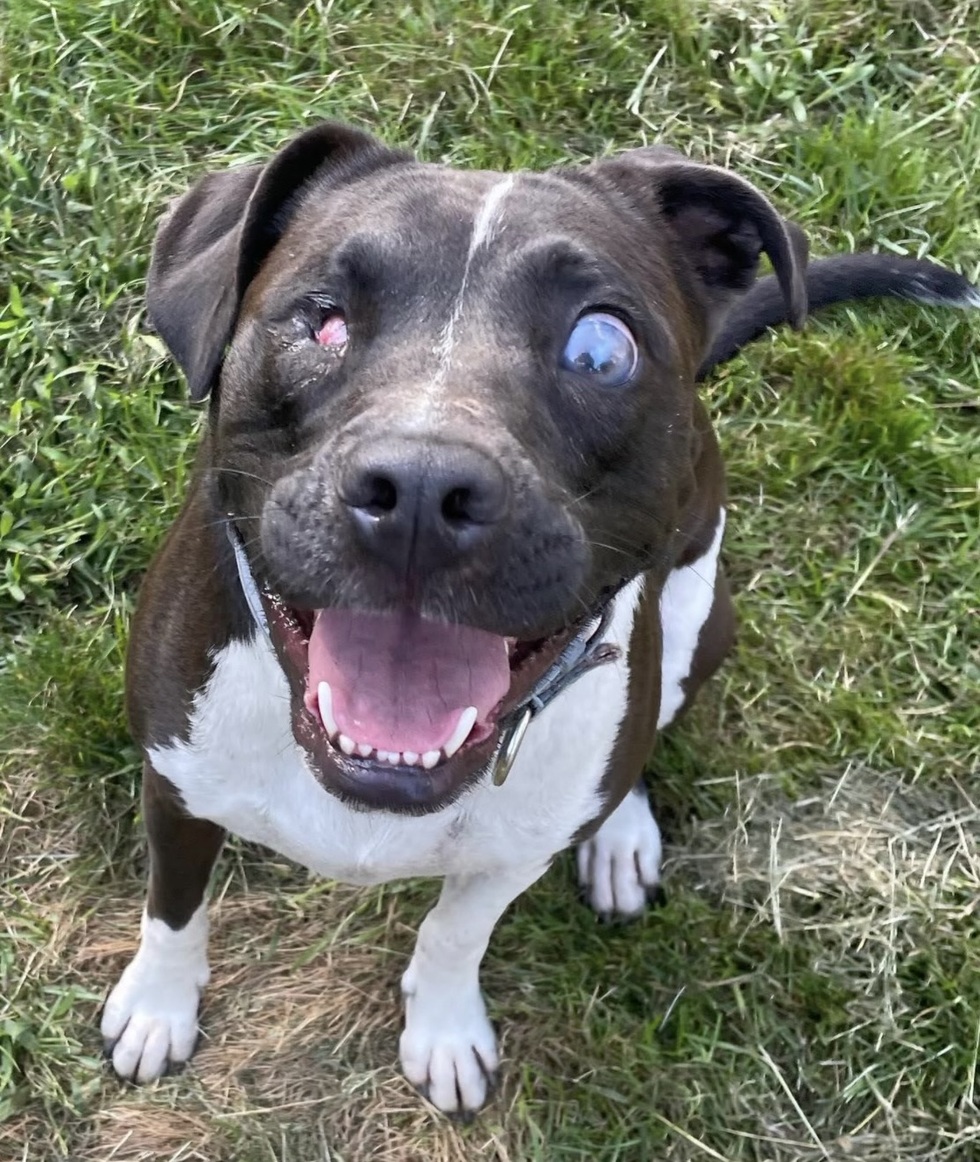 Fannie is blind but has zero fear. She gets around the house so smoothly and sometimes she can be stubborn when she’s outside & doesn’t want to come in so we have to carry her like she’s handicapped or something. for what she’s been through, she’s the sweetest dog ever.