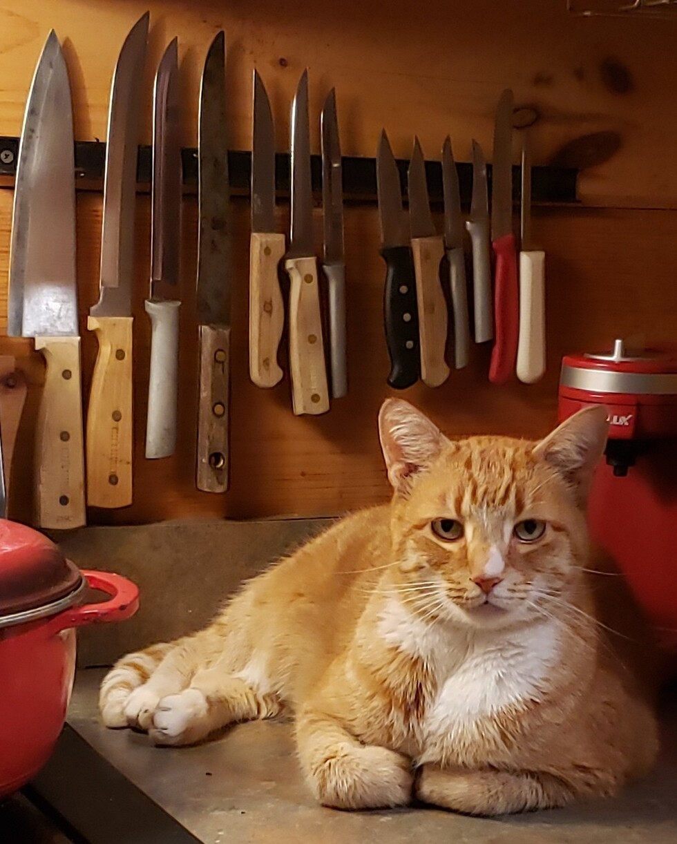Moxie and his litter mate, Toe came to us 15 years ago as tiny kittens. Both were 6 toed. Collectively we called them "Team Orange". Both have passed but their years of antics keeps them alive in our hearts. As Moxie aged he loved warming his old bones near anything that was warm like the oven in this photo. Despite his gruff look and background of knives he was a true lover. ❤️
