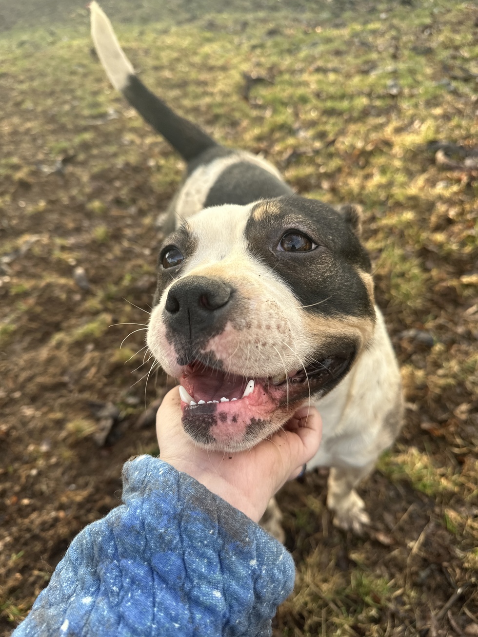 This is Anya! From what we know, she was just found as a stray in Eastern KY, so we have no idea what she may or may not have been through... Somehow, she is the most carefree, happy-go-lucky pup in the world and she has truly never met a stranger. Short, stout, and an absolute firecracker, Anya loves wrestling and rolling around in the back yard with her brothers, Bingo and Rudy... as evidenced by her *filthy* little legs. She is extremely food motivated, leading us to come up with nicknames such as "Miss Piggy", "Canine Vacuum Cleaner", and "Absolute Beefcake", all of which describe her perfectly. She has been nothing short of the perfect final addition to round out our little family. We love our girl and can't wait for many more years of cuddles and craziness with her in our lives!