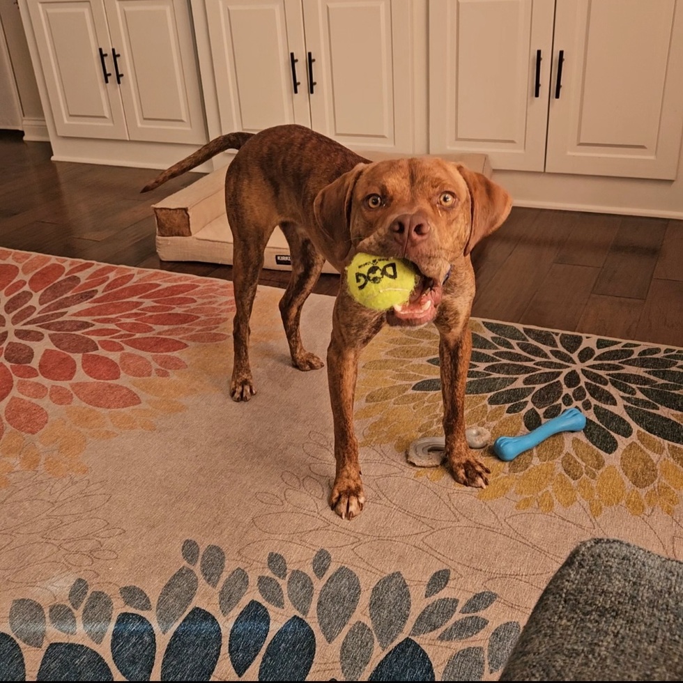 This Rooster may not crow at sunrise, but he will announce ball time with fighter-jet intensity. This one-year-old setter/pitbull/hound mix is equal parts chaos and cuddles — a flyby zoomie specialist, tug-of-war champion, and professional kid wingman. A true foster fail turned forever family member, his life motto is basically “play harder, love bigger, repeat forever.” Like his namesake from Top Gun 2, he lives life in the danger zone… especially when a tennis ball is involved. He came into our lives as a foster on his way to his forever home — but we quickly realized we needed him far more than we knew. With his goofy grin, endless zoomies, heart full of love, and championship-level snuggle sessions, Rooster found his forever home… especially with his favorite copilot — a 5-year-old boy who never goes anywhere without him. Wherever that little boy goes, Rooster is right there, ready for the next mission.