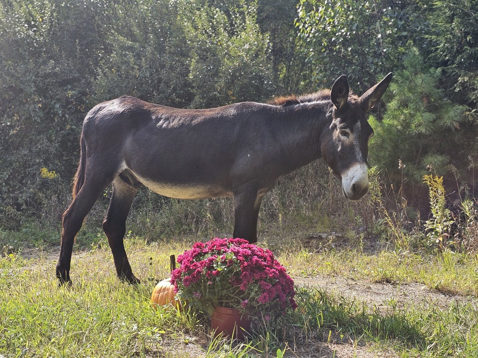 Douglass posing with mums and pumpkin