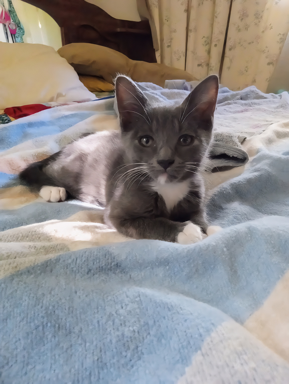 I adopted this kitten on Aug 14. 2025. His shelter name was Stonewall, but I have since renamed him Dash. He is very sociable and has brought much fun and joy to our household. He likes wrestling with his big brother Stormy and watching TV.