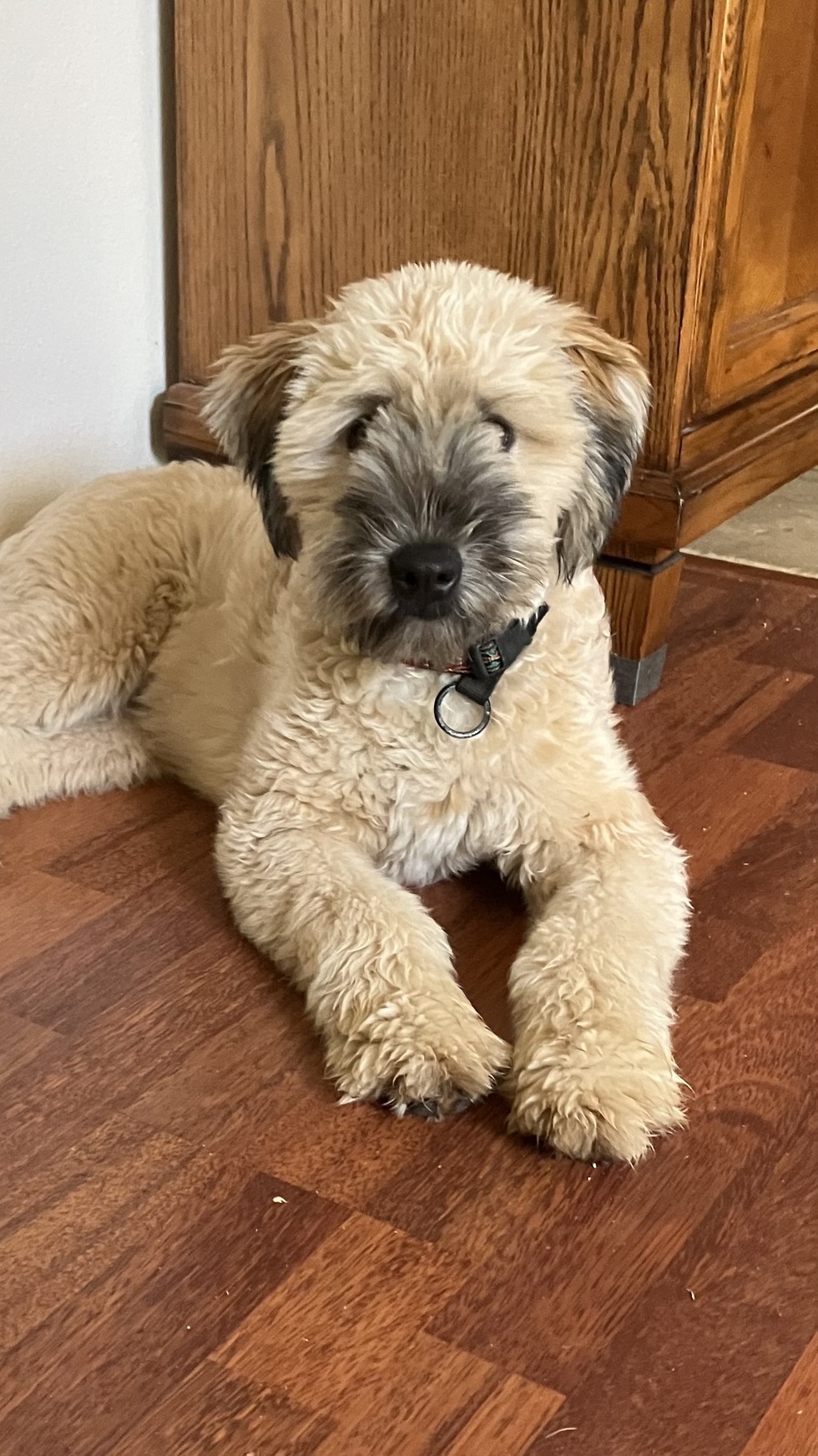 I’m Evan, a Soft Coated Wheaten Terrier. I’m an 8 month old female who loves to play fetch, walk on the beach, run and play with my family and eat ice cubes…:))