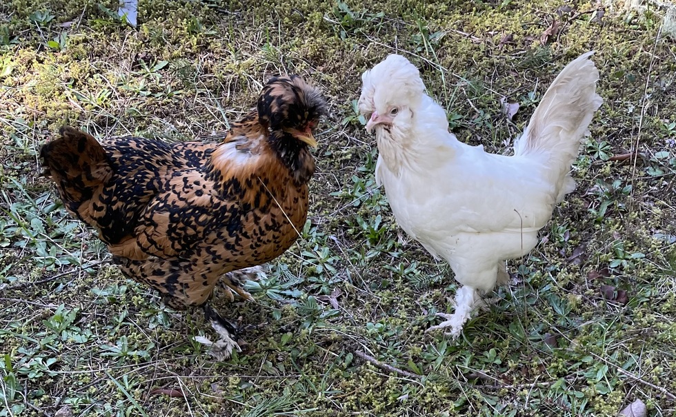 Pretzel and Glamour were adopted from the shelter where I worked in California. Pretzel appears to be a Pavlovskaya chicken and Glamour is a 12 year old (!) Sultan chicken.