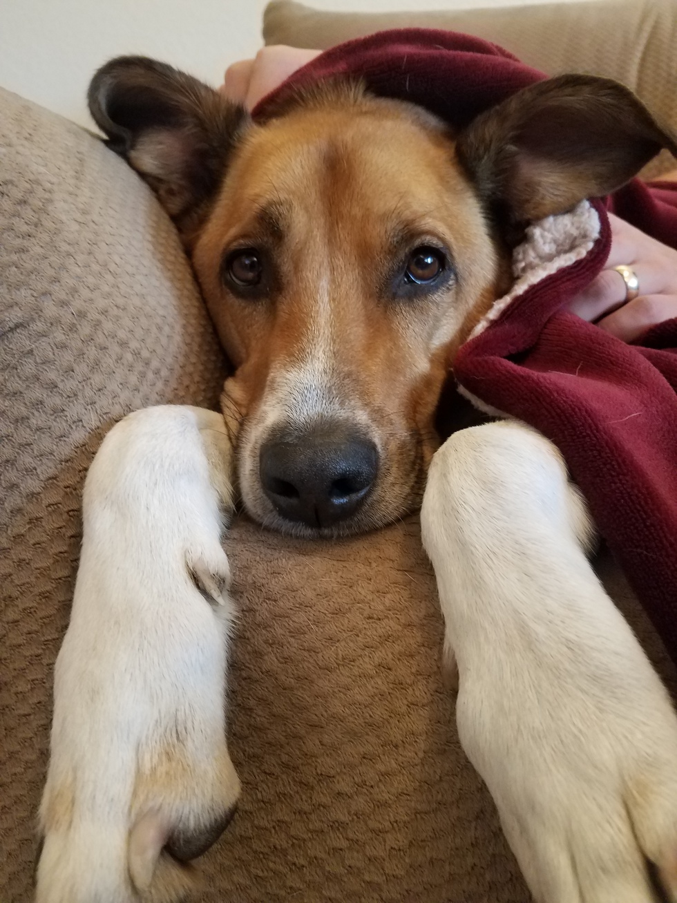 This 7-year old mystery mutt is a total cuddle bug, fetch addict, and high five master. He has resting pout face and can often be found snuggling with his favorite piggy toy.