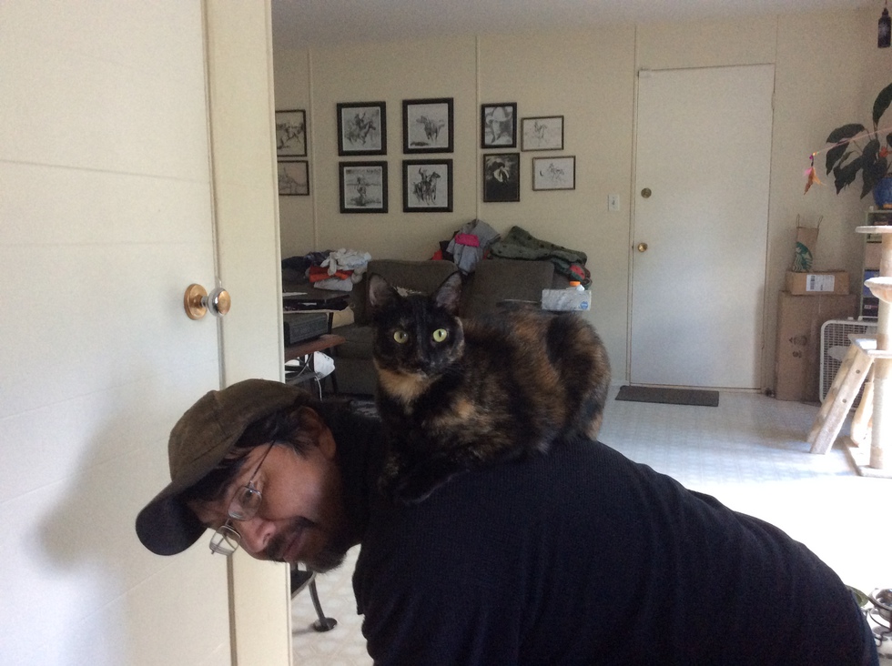This is our rescue that we got from the Bellevue Humane Society last year and she loves to be on her dad‘s back!