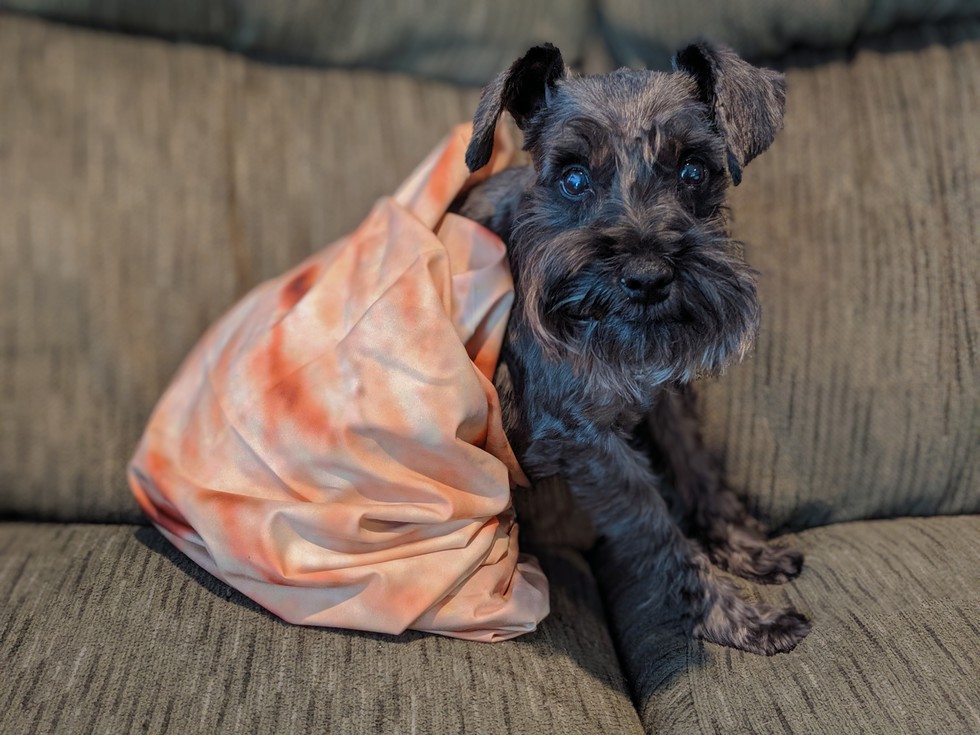Beardsley is a 10 year old mini Schnauzer, pictured here in his burrito-themed blanket.