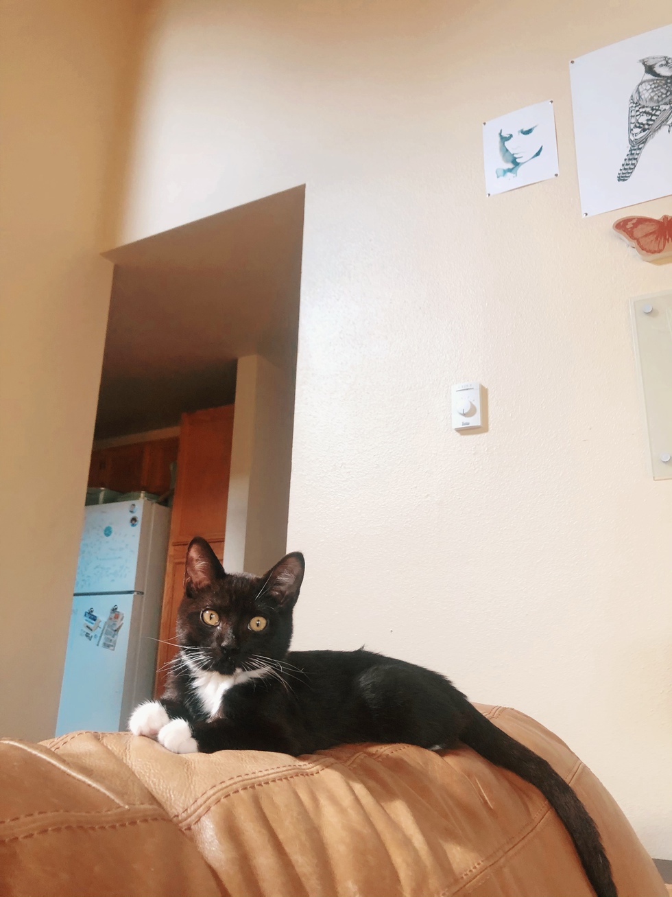 Pet's Story or BioPixel is a 3 month old kitten, recently adopted from Seattle Humane after being found alone at just a few weeks old in Yakima Washington. After struggles with weight and heart problems she is thriving in our home and already has her favorite pillow, blanket, under the bed spot, and toy.