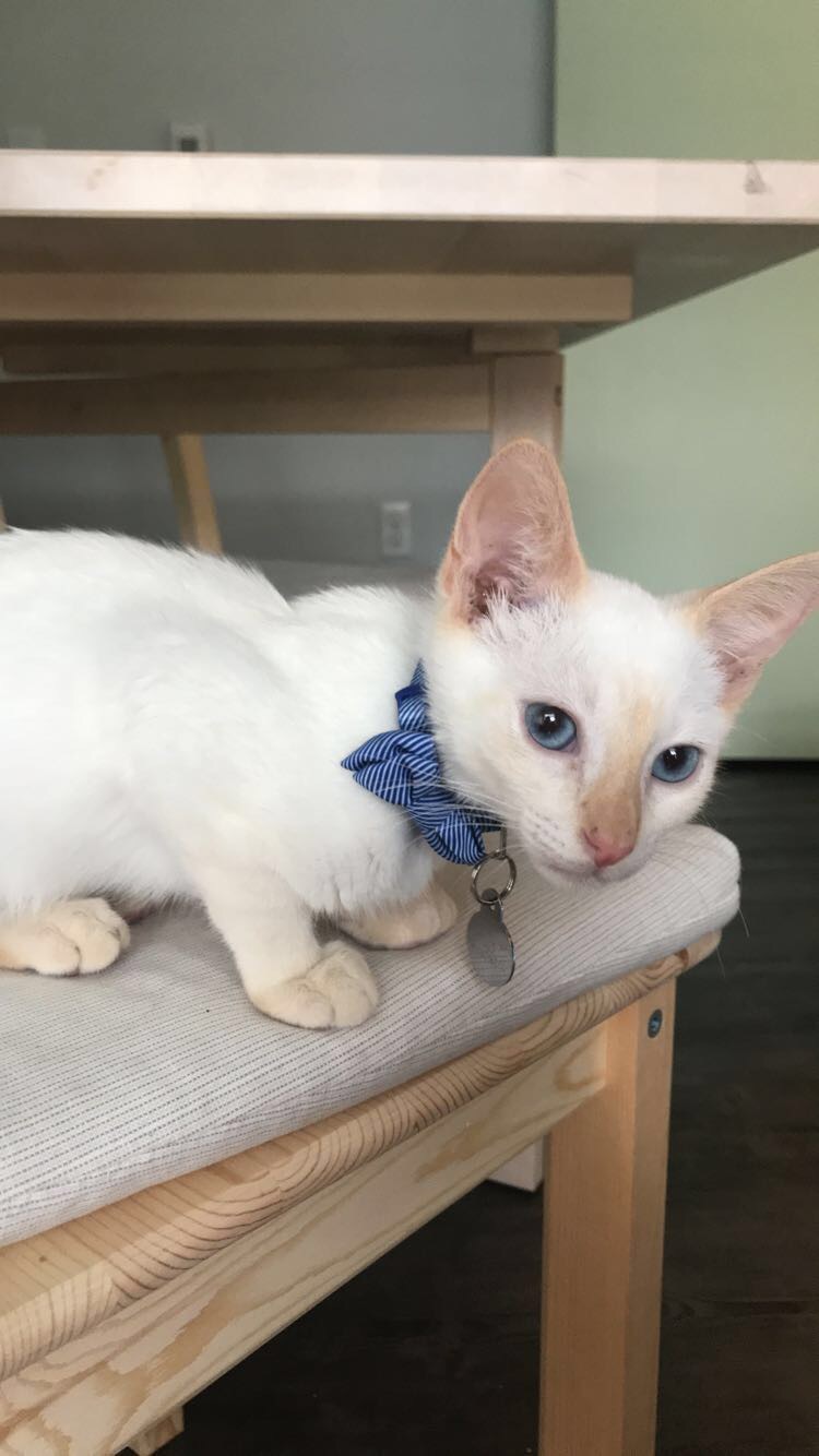 Pet's Story or BioHello, my name is Waxillium, but you can call me Wax! I am five months old and originally from Hawaii! I love to play fetch, look dapper, tear up toilet paper, cuddle with my mom and dad, and lay out by the window to stalk birds and scary cars. I am very curious as the old saying goes, and just discovered that when I meow close to a fan, I sound just like a robot, you should try it, it’s super fun! I love getting head rubs and ear scratches, but not so much belly rubs. Please vote for me, Mom said that she’ll get me a new bow tie if I win!