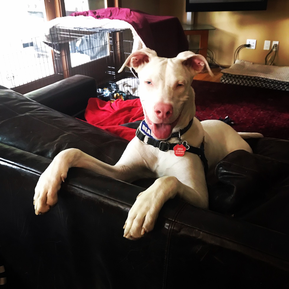 Pet's Story or BioJulius was adopted from the Seattle humane society in March when he was 4 months old. He's a boxer/shepard/pit mix. He's albino and deaf and full of energy! He loves to experience life using his other senses and is always making us laugh with his goofy antics!