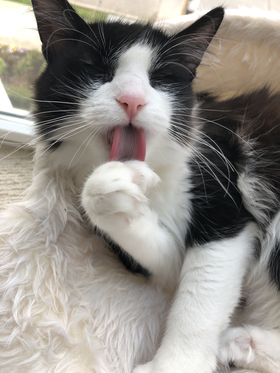 Pet's Story or BioMeet Watermelon (aka Mel)! She was our first foster (turn fail) from SH, adopting her February 2018. Watermelon loves to wake up her humans by sitting on their chest and lick at their nose. She is great to have conversations with, loves belly rubs and runs across the house when someone sneezes. When she isn’t taking cat naps or snacking on turkey, she helps out being a great cat mom to other foster friends!