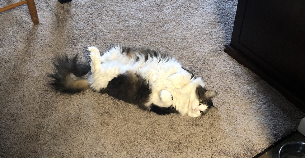 Bommeke was adopted with her sister Babette about a year and a half ago from Seattle Humane. Her favorite position, especially when she wants snuggles, is lying on her back in random parts of the house.