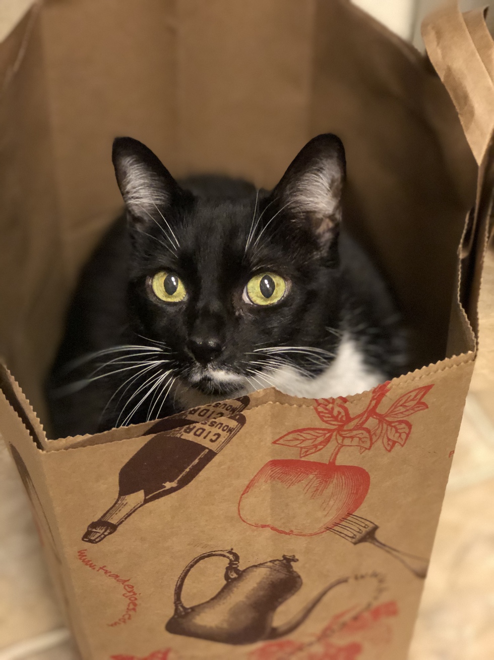 Pet's Story or BioMinimi is a 12 year old Tuxedo "smarty pants" who jumps into any bags, boxes, or suitcases the second one appears on the floor!