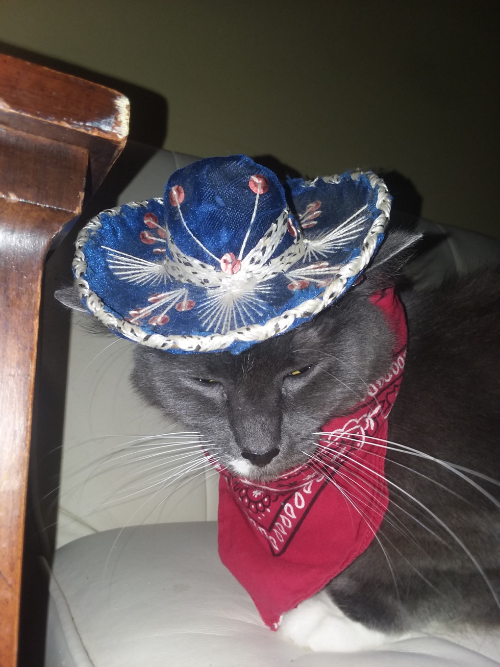 I recently adopted him from humane society. In his leasure time he likes watching cooking shows , climbing my leg and boxing! He is a welcome addition to my home.