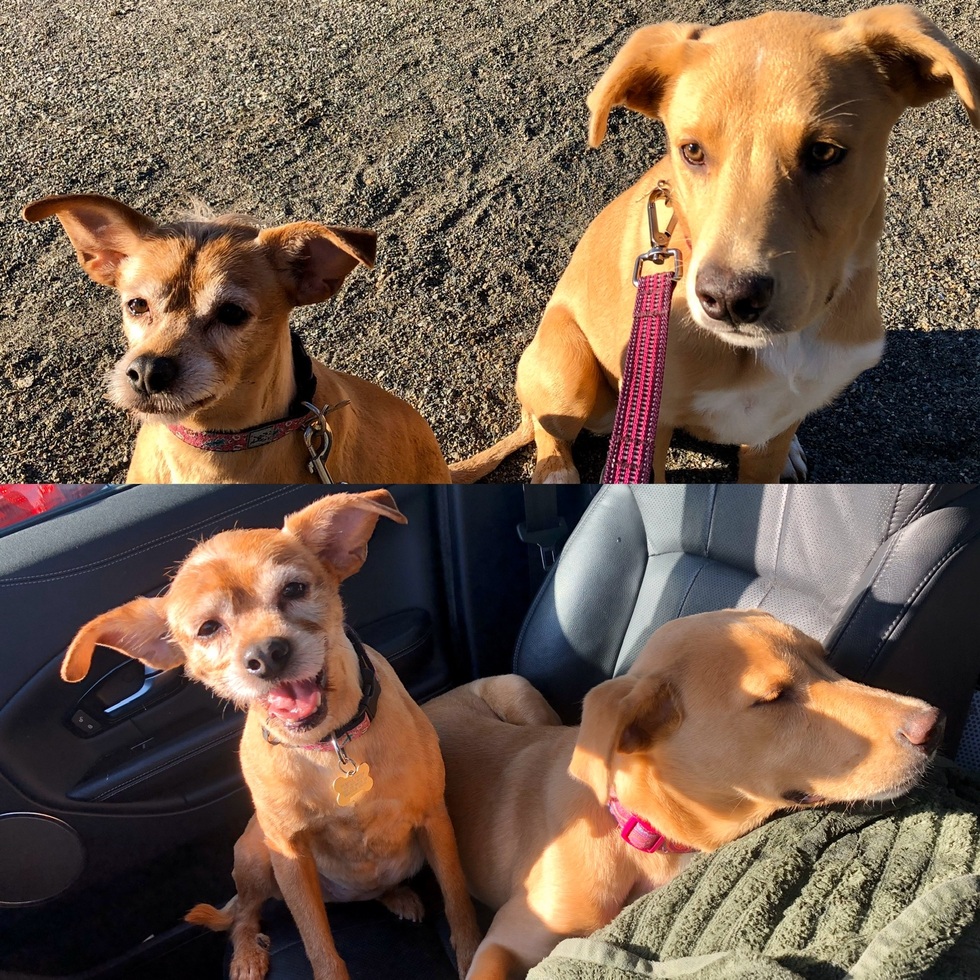 Sisters who love their trips together. Both are rescue dogs, one from a high kill shelter in CA and the other from Seattle Humane.