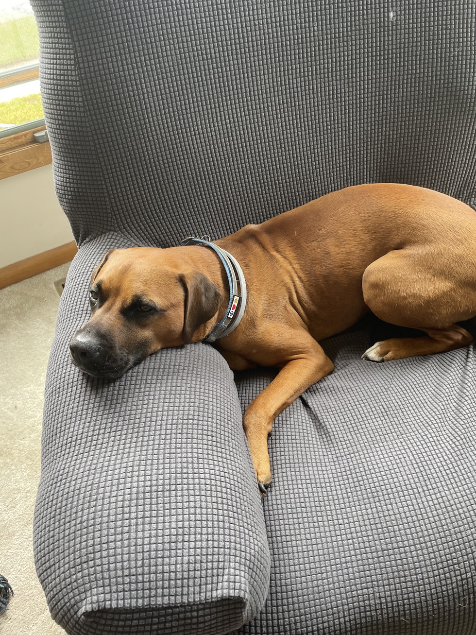 Paxton was adopted from the Alcona Humane Society almost two years ago. He is the most loving, cuddly boy, who always wants to be up close and personal. This is a brand new chair I was very much looking forward to sitting in but Mr. Paxton has claimed it for himself and even turns it towards the windows so he can lay in it and watch everyone go by during the day 😂😂. He definitely has a lot of personality. He will bark if you walk by, but he is just saying hello and wants you to say hello back.