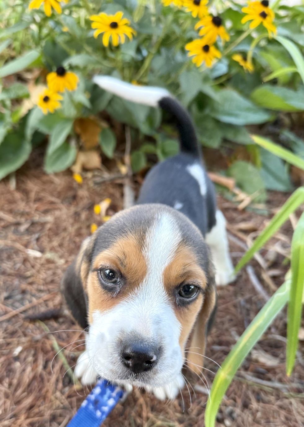 Miles is a very affectionate and adventurous 9 week old puppy. He might be a small puppy but there isn’t anything that this little pup will not try to learn. Loves bath time as well sleepy time nestled in his cozy bed. His nose leads him to many new areas to explore complete with his very own personalized Sherlock Miles costume. Nothing says beagle without that cute howl with his head straight up.