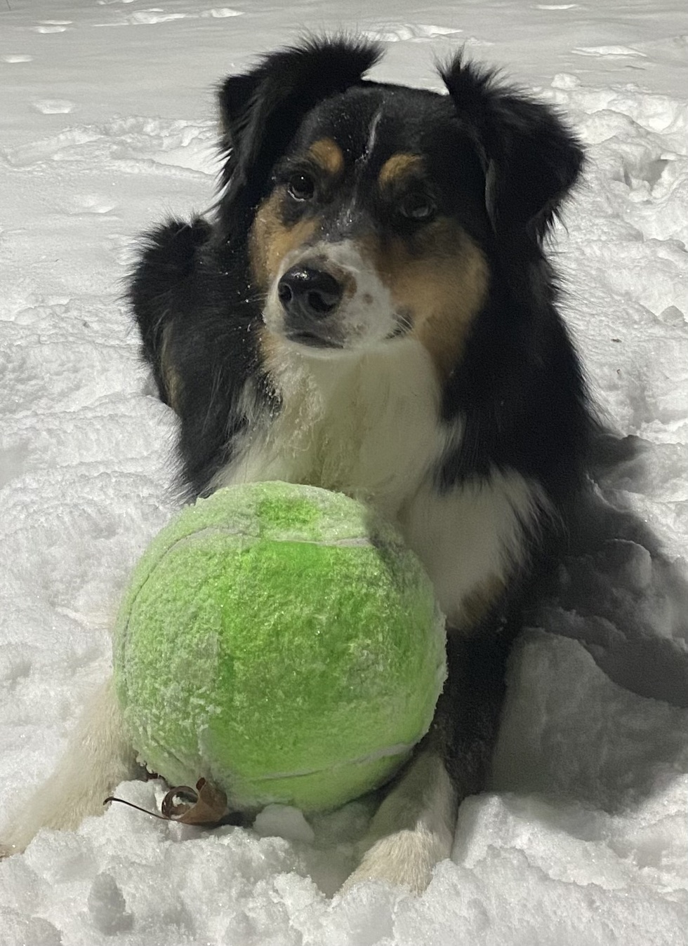 Ace is an Australian Shepherd. He was born in Idaho. Ace was surrendered and found his way to Michigan through adoption! He loves playing ball and he loves winter time!!